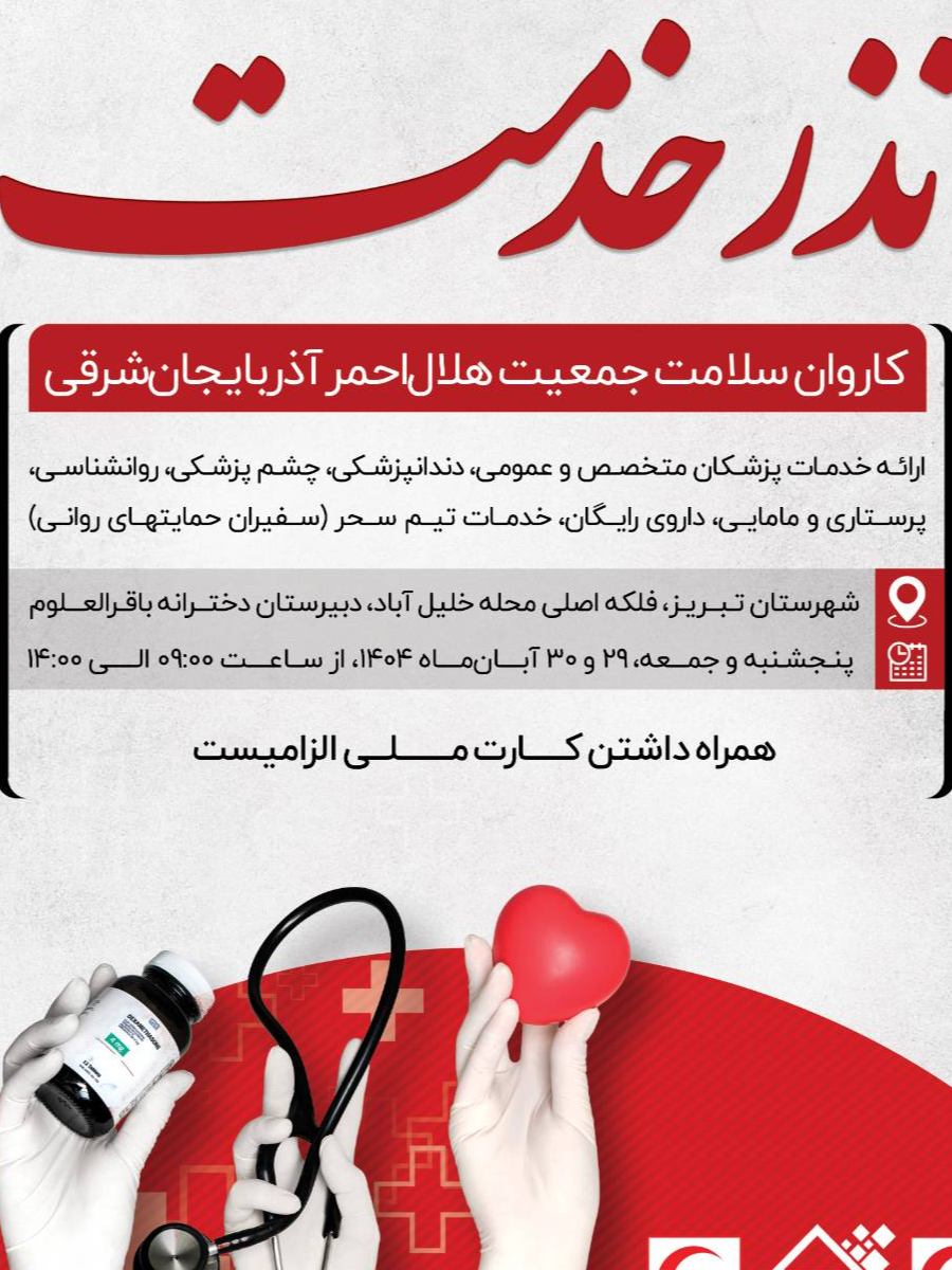 کاروان سلامت جمعیت هلالاحمر آذربایجانشرقی همزمان با ایام شـ.هادت حضرت فاطمهالزهرا(س) و هفته بسـ.یج، با مشارکت گروه جـ.هادی شـ.هدای سلامت دانشگاه علوم پزشکی، جمعیت هلال احمر شعبه تبریز، پایگاه مقاومت بسـ.یج شـهدای گمنام هلال احمر استان و خانه هلال یادمان شـ.هید مالک رحمتی، با ارائه خدمات تخصصی پزشکی، دارویی و آموزشی، به بیش از ۲۲۰ نفر از اهالی کوی شربت زاده، در مدرسه ثامن الائمه مستقر شد.