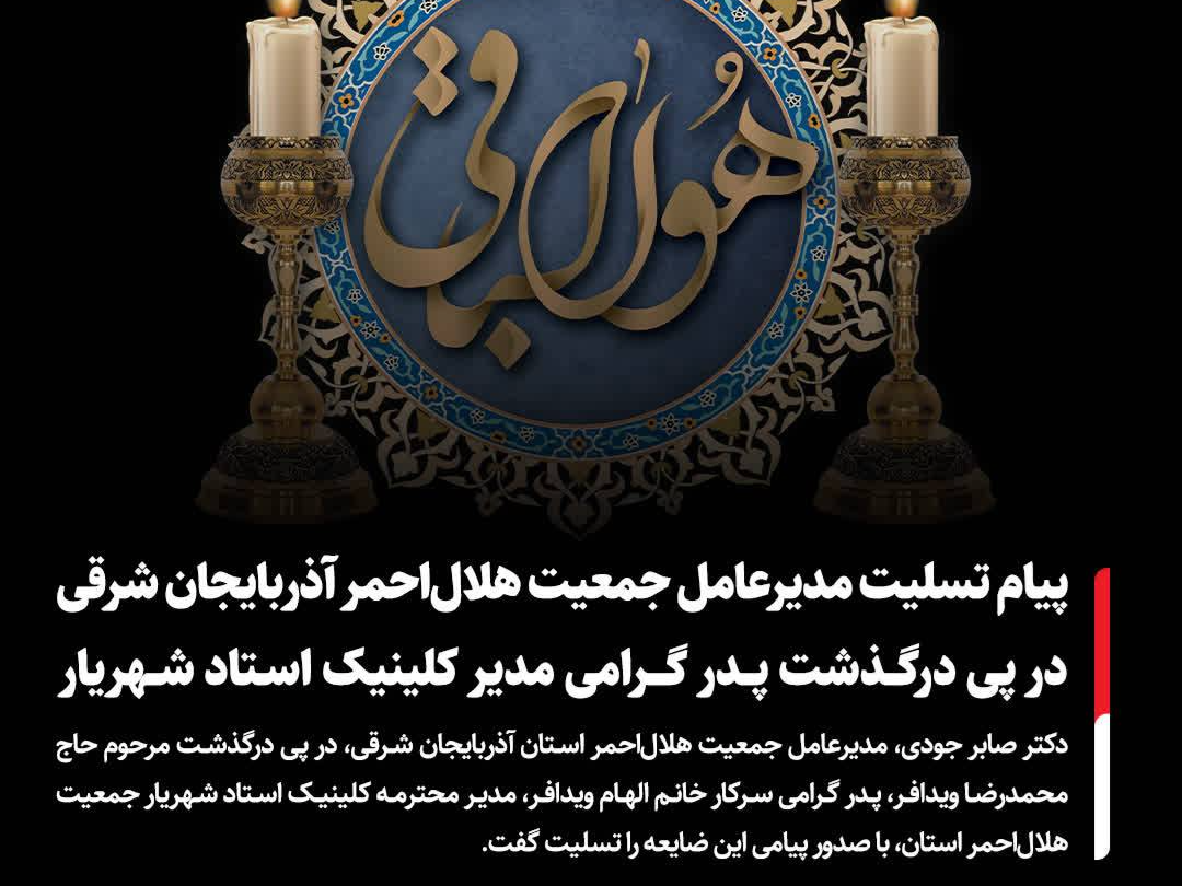 دکتر صابر جودی، مدیرعامل جمعیت هلال احمر استان آذربایجان شرقی، در پی درگذشت مرحوم حاج محمدرضا ویدافر، پدر گرامی سرکار خانم الهام ویدارفر، مدیر محترمه کلینیک استاد شهریار جمعیت هلال احمر استان آذربایجان شرقی، پیام تسلیت صادر و این ضایعه را به خانواده محترم ویدافر تسلیت گفت